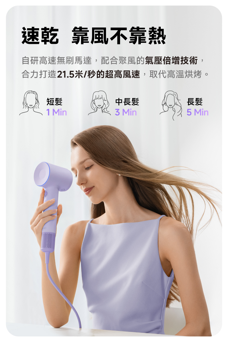 ✨3分鐘快速乾髮 - 馬達轉速提升3000轉/分鐘,21.5m/s颱風級風速