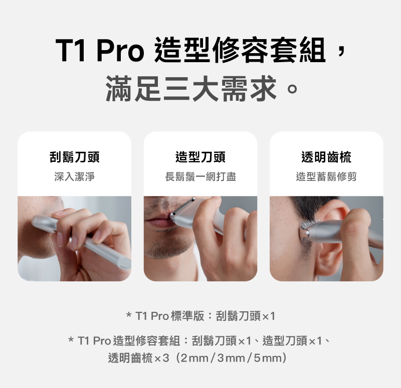 ✨更萬用 - 造型套組內建「造型刀頭、刮鬍刀頭」,以及3種長度的透明齒梳,